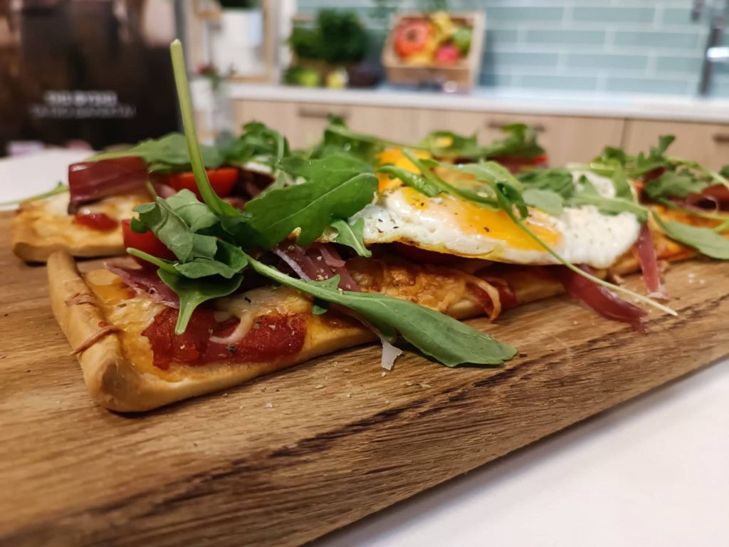 Σερβίρουμε τις τηγανίτες στοιβαγμένες ψηλά και αλείφουμε με σπιτική πραλίνα σοκολάτας και φρέσκα φρούτα.