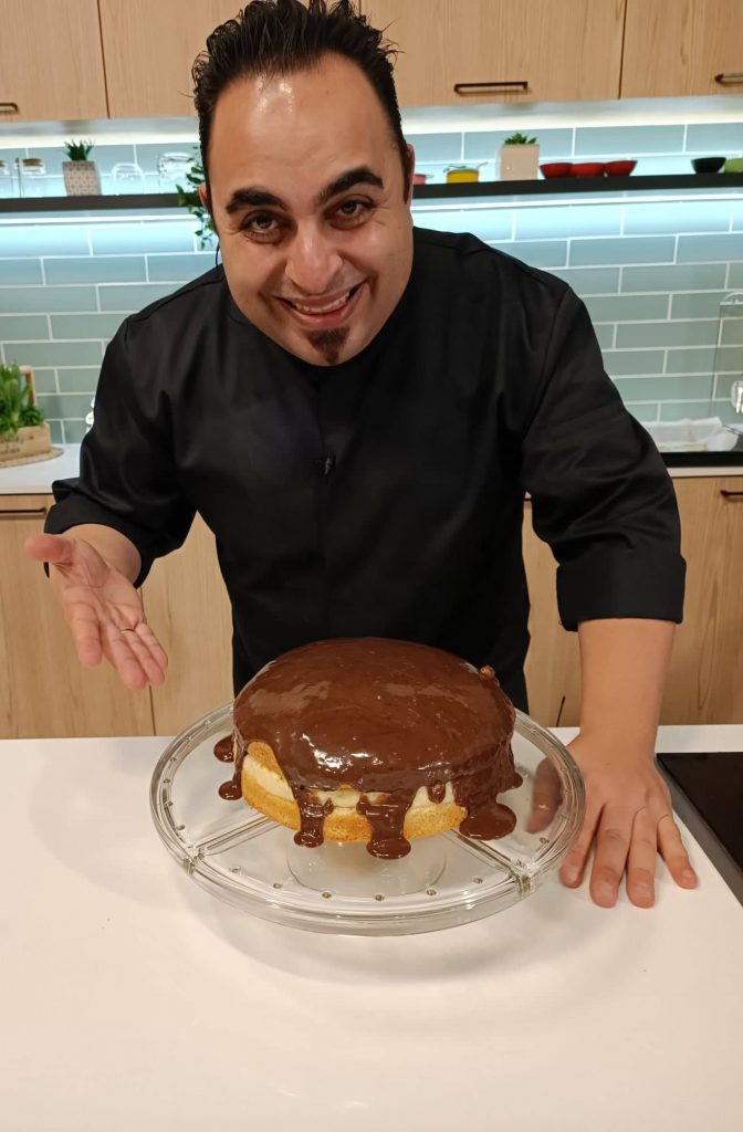 Για το στήσιμο του κέικ: Τοποθετούμε το ένα στρογγυλό κέικ σε μια βάση του πιάτου, αλείφουμε με μια σπάτουλα την κρέμα ζαχαροπλαστικής στο κέντρο του κέικ και απλώνουμε ομοιόμορφα. Τοποθετούμε από πάνω το δεύτερο κέικ και από πάνω την κρέμα ζαχαροπλαστικής, και πιέζουμε ελαφριά το πάνω μέρος του κέικ να στηθεί ομοιόμορφα. Ρίχνουμε τη γκανάζ σοκολάτας πάνω από το κέικ, στη συνέχεια απλώνουμε στην άκρη του κέικ, αφήνοντας λίγη από τη σοκολάτα να στάζει από τις πλευρές.